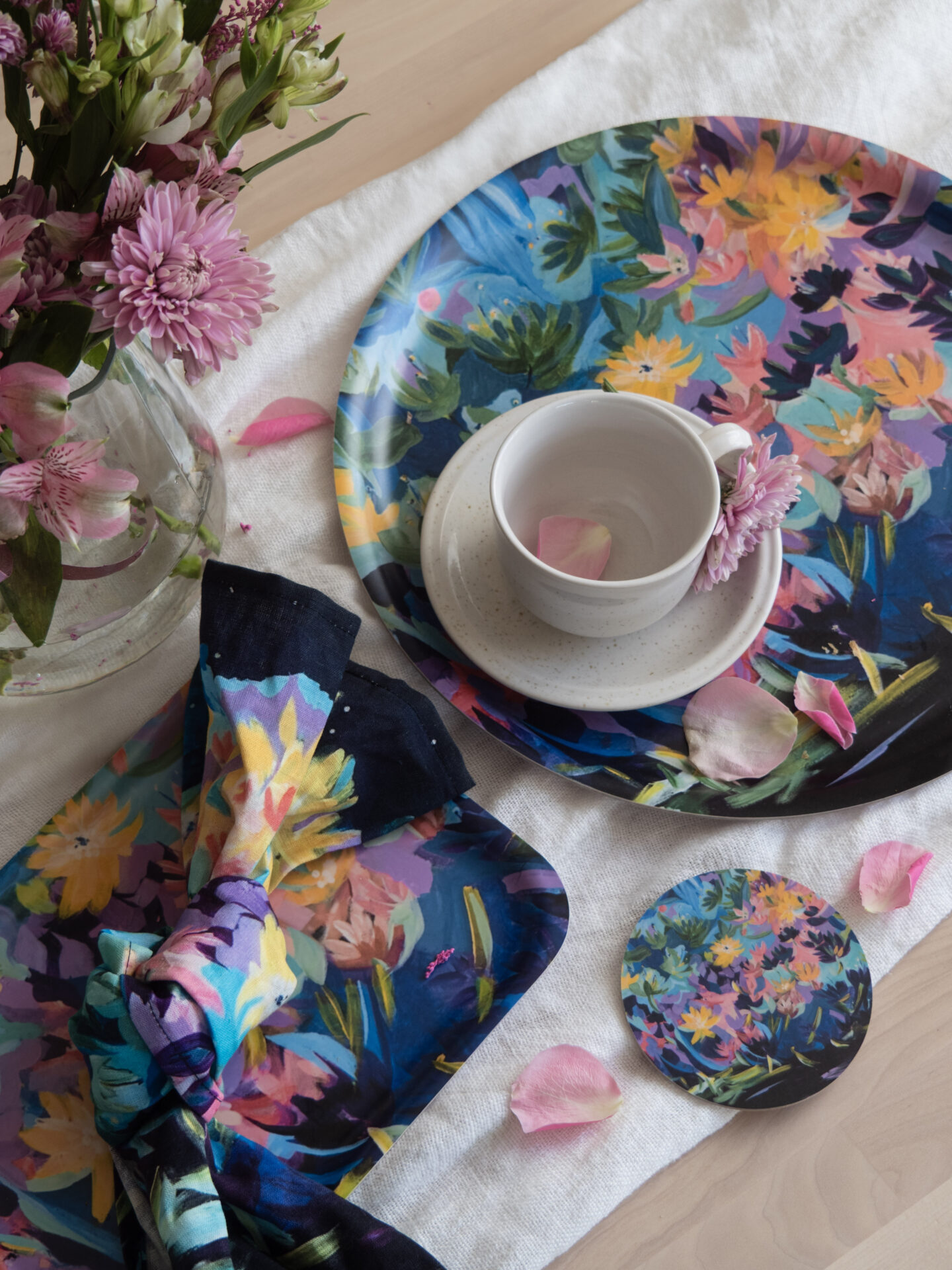 Maalauksistani valmistetaan myös arkitaidetuotteita. Arkitaidetuotteet ovat koivuvanerisia tarjottimia ja puolipellavaisia pyyhkeitä, arjen ilahduttajia.