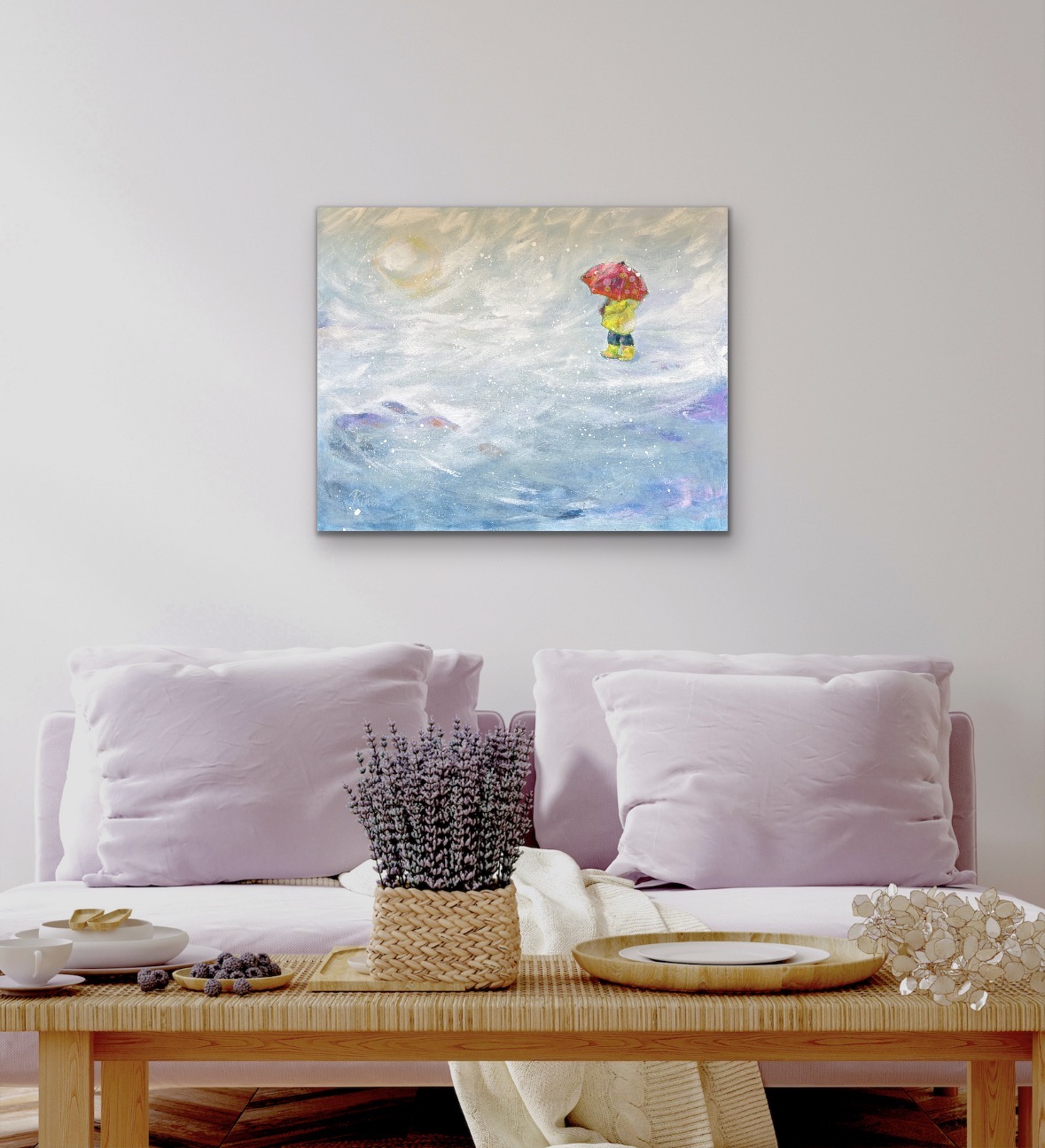 Pieni hahmo avaran maiseman keskellä punainen sateenvarjo suojanaan. Maailma ympärillä on kuin sumua, valoa ja liikettä. Teos pysähtyy hetkeen, jossa kulkija jatkaa rauhallisesti matkaansa.